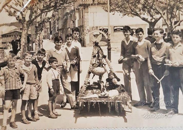 Feitos en plan casero, sin colas adherentes nin baldosins artisticos, feitos pola rapazada cas suas propias mans. Primeiro pola dereita, Nelo Guimil, a esquerda o pequeno de tirantes Miguel Frieiro, dia dos Maios na Alameda
