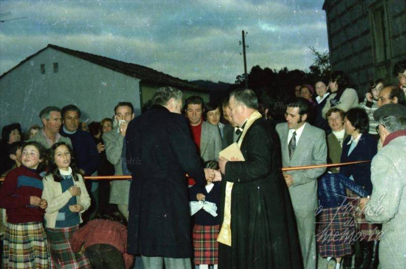 Era Tarrio, cura de Sobradelo, os veciños rodeando a cinta de inauguracion da nova carretera no lugar da Xesteira