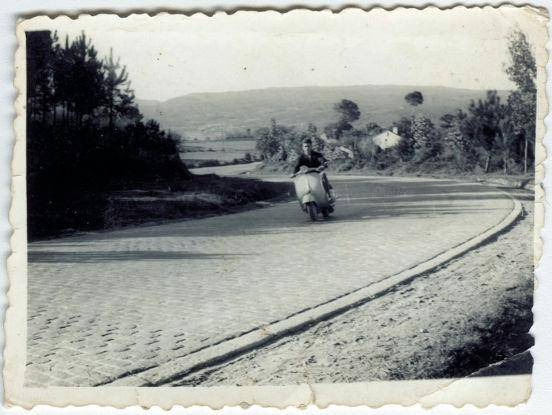 Fotografía perteneciente a la fototeca del Concello de Cambre en la que aparece Pacucho tomando la curva do Piruchino. Ubicada en la N-550 dirección Santiago de Compostela. Más concretamente encaminándose hacia Tabeaio. Detrás, al fondo, las primeiras casas de Altamira. Más a lo lejos, los montes de San Miguel de Culleredo. Nótese que la vía no está asfaltada, sino adoquinada.