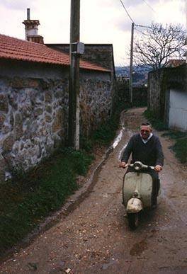 Finalmente, vemos en una foto relativamente reciente, a Juan Padre circulando por el Camiño da Quintela en Navia, un día lluvioso, antes que este camino fuese cementado y alisado por los vecinos del lugar.