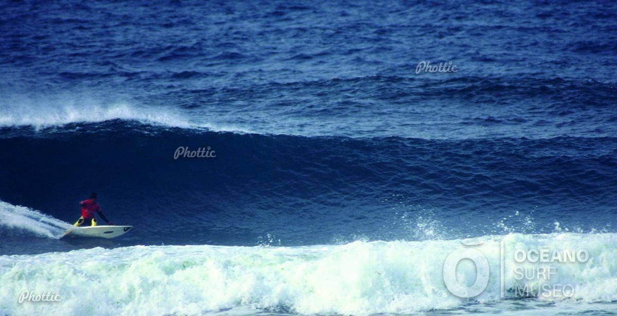 Un surfista que no hemos podido identificar se desliza sobre las olas de Pantín. La foto, fue tomada por Gonzalo Cueto durante las pruebas del campeonato de 1997. La imagen nos traslada una experiencia que es imposible describir con palabras. Los surfistas que se deslizan sobre las olas se evaden, el surf les transporta a una realidad completamente distinta. ¿Existe un pasatiempo mejor?