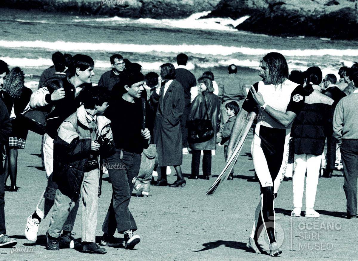 La presencia de figuras del surf como Jeremy Serwyn (en la foto en 1990) y amabilidad y cercanía de estos deportistas propició la aparición de fans y seguidores, especialmente entre los más jóvenes. En la imagen, varios adolescentes a la caza de autógrafos.