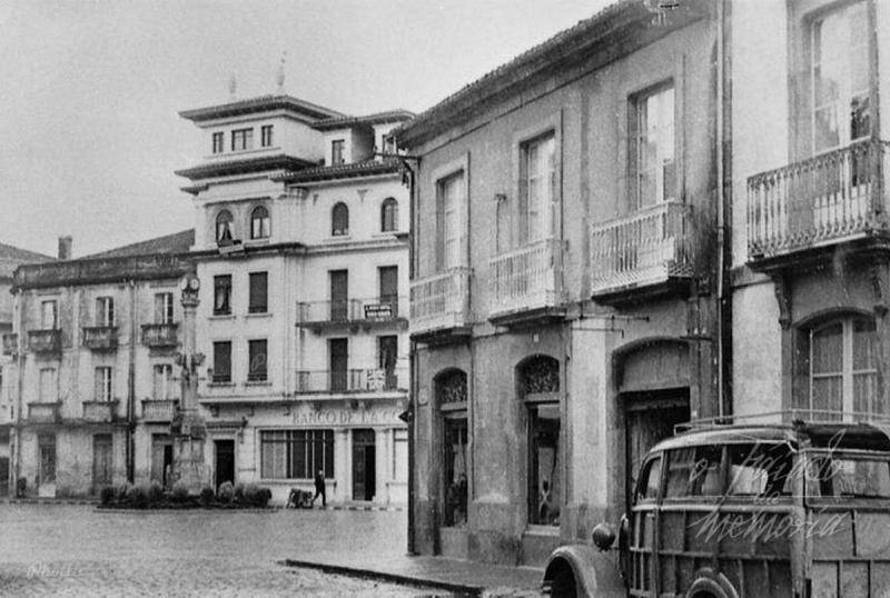 Unha fotografia que nos permite ver a casa do medico Viqueira, un cachiño, o coche aparcado e unha xoia de outras epocas, a continuacion o edificio que nos baixos tiña a merceria e varias cousas mais propiedade de Balbino Costa, na outra esquina a libreria Buceta, a o seu frente Juan, mutilado de guerra. De frente o edificio do Banco da Coruña, a o seu caron a casa na que no baixo tiña Segundo Abalo e a sua dona Estrella unha tienda de comestibles moi ben surtida, con uns escaparates bastante espectaculares sobor de todo no Nadal. Toda a manzana en canto a edificios con moita mais valia que o que logo chegou...o Lara