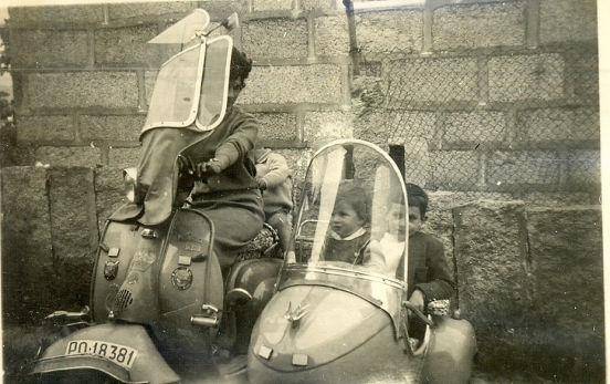 Retrato de la familia de Manuel Cernadas en su lambretta con sidecar, la cual, además de los parabrisas contaba con un maletero para llevar a los perros cuando se iba de caza, un reloj, una radio y un dispositivo para conocer la carga de la batería. El aumento de potencia en el motor, los espejos, intermitentes, las barras de protección, el avión y la golondrina que adornan el morro del scooter y del sidecar, la elección de la pintura y el tapizado de los asientos, son otras de las personalizaciones que realizó Manuel a su pintoresca montura.