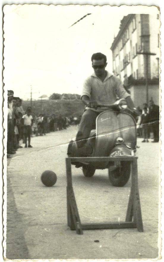 "Prueba de habilidad. Gimcana. Año 59. Fiesta de Birloque en cuartel de la Guardia Civil". En esta fotografía vemos a Pepe Yuma subido a su vespa, intentando patear la pelota con la intención de colarla entre los tres palos".
