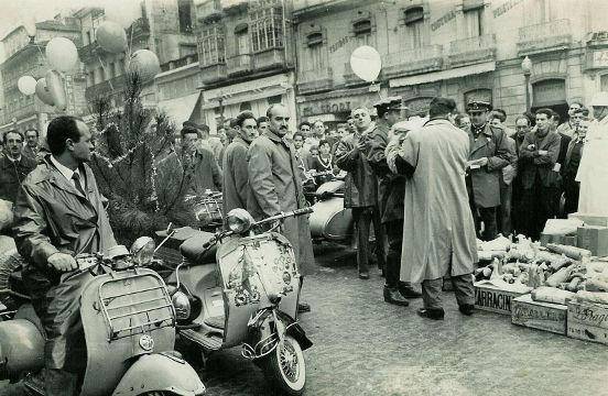 Fotografía de varios integrantes del Vespa Club Vigo haciendo entrega del aguinaldo a los guardias vigueses en la que hoy se denomina como Puerta del Sol, al final de la calle de El Príncipe. Aunque por aquel entonces y durante más de 40 años, se conocía como Plaza del Capitán Carrero. En el centro posa Salvador Jané. Con bigote y las manos en los bolsillos de su gabardina. Su hijo Jorge Jané, data la instantánea entre 1958 y 1960. Como se puede apreciar, no siempre ha sido peatonal. Se trata de la calle comercial de la ciudad por excelencia. Con de todo tipo de comercios, cafeterías y establecimientos de las mejores marcas. Siempre bulliciosa, se denominó como “del Príncipe” en el año 1860 en honor al que años más tarde se coronaría como Alfonso XII. En 1931 pasó a llamarse Capitán Galán, pero recuperó su denominación original cinco años más tarde. De fondo se pueden contemplar los carteles de dos establecimientos emblemáticos ya desaparecidos: "Almacenes el Pilar" y "El Sport". Debajo de estas líneas, aparece un anuncio del Taller de Salvador publicado en la Revista nº 5 del Vespa Club Vigo, en septiembre de 1958.