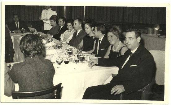 Mesa Presidencial correspondiente a la cena del Vespa Club Vigo con motivo de su V Aniversario, celebrada en los Salones del Real Club Náutico de Vigo. El 11-10-1962. Debido al recelo levantado entre algunos socios del Náutico, al año siguiente la directiva vespista celebraría este evento en las instalaciones de Las Siete Torres. De Derecha izquierda aparecen con sus esposas: Manuel González Moreira (Vicepresidente), Jose Luis Veiga (Secretario), Julián Mouriño (Presidente) y Antonio Monje (Tesorero). El resto de la directiva la conformaban: Enrique Pérez Pazos (Contador), y los vocales: Graciano Campos, Solla, Benito, Luis Pedrero y Miguel Martins.