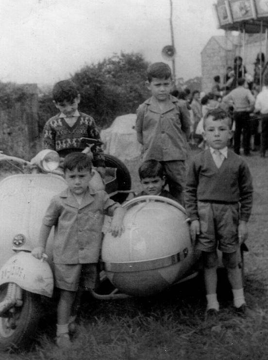 Fotografía de Berto Silva rodeado de sus amigos posando en el sidecar de su padre, con un tíovivo de fondo.