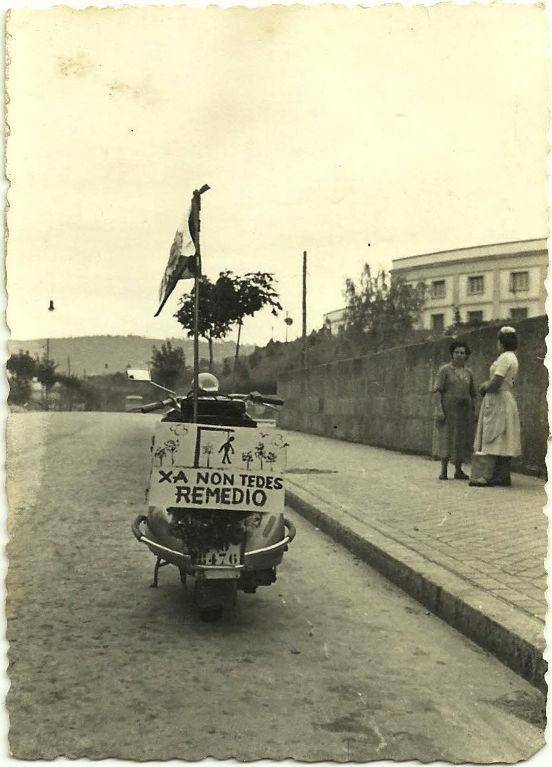Algunas de las Vespas de los compañeros y amigos del VESPA CLUB VIGO invitados a la boda del Sr. Moreira, llevaban carteles con tintes humorísticos. En este caso, estamos ante un sutil lienzo que se mueve entre lo abstracto y lo figurativo... pero con un mensaje demoledor: "Xa non tedes remedio".