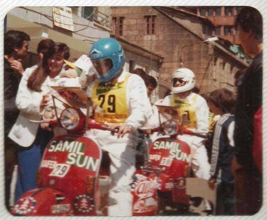 Con Kaifer (diastribuidor oficial de Vespa en Vigo) y Samil Sun (Discoteca que se encontraba en los bajos del hotel Samil) como principales patrocinadores, en esta fotografía aparecen los inseparables Manuel Portela (con el casco azul y el dorsal nº 29) y Alberto Alonso (con el dorsal nº 30 y casco blanco) a punto de afrontar una Volta a Galicia de 1981. Sus buenos resultados en distintas competiciones les llevaron a conseguir estas “vespas 200 de fábrica con intermitente”. Nada que ver con las 200 básica y las 160 con la que ganaron el año anterior esta misma prueba.