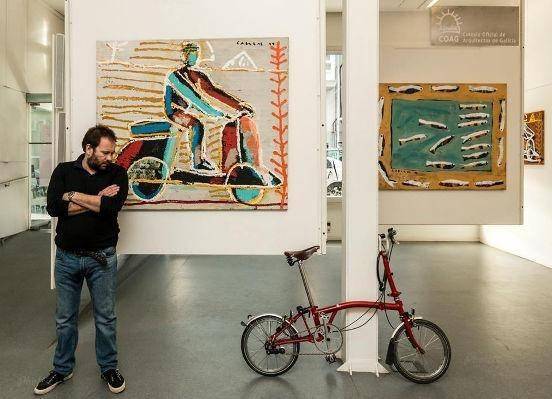 Érase un pintor a una bicicleta subido, al que un día conocí en un peculiar gallinero. Iván, su gallo, nos presentó. Lejos de los tópicos que persiguen artículo tras artículo al pintor coruñés, el día que lo visité, buscaba toparme con su polifacético espíritu creativo... más que refugiarme en sus clichés. Después de varios cruces de llamadas, quedamos de vernos en su estudio. Media hora antes que los ingleses empiecen con su ritual del té. Desde una de las ventanas, me lanza la llave del portal. ¡El telefonillo no funciona! Subo las escaleras de un edificio noble, añejo y con solera. En plena Plaza de María Pita. En el tercero me topo de bruces con un timbre rotulado por un corazón. Llamo y es el propio Jorge quien me invita a adentrarme en su particular Shangri-la.