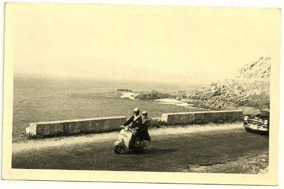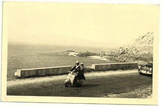 El 26-7-1959, tras dar por concluidos los actos oficiales correspondientes al I Rally Nacional celebrado en Galicia, un grupo de miembros del Vespa Club Vigo se brindó a dar un paseo en Vespa con algunos de los asistentes que decidieron prolongar su estancia en nuestra tierra. En esta fotografía aparecen Julián Mouriño y su esposa María Estrella, en la carretera que une las localidades de Baiona y A Guarda.
