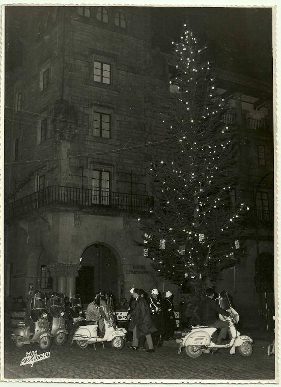 23 de diciembre de 1965. Como era habitual en aquellos años, el Vespa Club Santiago hace entrega del Aguinaldo a los guardias de la ciudad llegada la Navidad. En esta fotografía destaca el enorme e iluminado abeto que preside las inmediaciones del Hotel Compostela. También su altura de casi tres pisos, los tres bacenillas que lo custodian y que en Santiago, en los años 60, no había vespista que no llevase cortaviento.