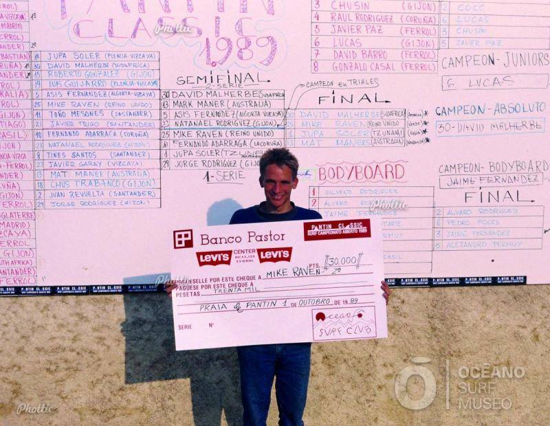 El británico Mike Raven, en 1989, posa satisfecho con el cheque (aún en pesetas) del segundo premio y tras la pizarra que reflejaba el palmarés del campeonato. En aquella primera edición del Pantín Classic ganó el sudafricano David Malherbe. En la final el australiano Mat Manners fue tercero y el español Jupa Soler cuarto.