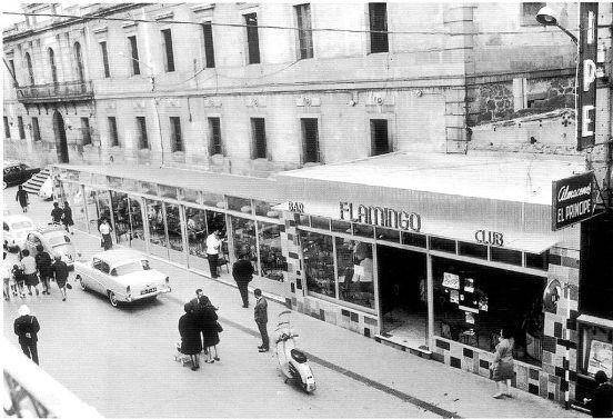 Tanto en los años 50 cuando respondía al nombre de "La Marquesina", como posteriormente en los 60 al nombre de "Flamigo", este céntrico café vigués era un popular y obligado punto de encuentro para los amantes de la música en directo y las tertulias. En su interior actuaban orquestas que de manera animada interpretaban un amplio repertorio de estilos musicales. Los camareros iban vestidos con unas inconfundibles chaquetillas blancas sirviendo cafés por las mañanas y refrescantes cocktails cuando caía la tarde. Su amplia cristalera hacia la calle de El Príncipe, sin peatonalizar y con acera, era otro de sus atractivos y al mismo tiempo ua impagable fuente de distracción. Nunca una fotografía ha ilustrado tan bien la frase de "aparcar justo delante de la puerta", como esta, con la lambretta estacionada justo enfrente de su entrada principal. Como último apunte, indicar son dos los edificios emblemáticos que podemos contemplar en esta instantánea. Por un lado la cárcel reconvertida en juzgados (hoy Museo MARCO) y el cartelón de ALMACENES EL PRÍNCIPE.