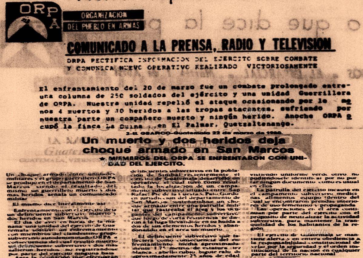 El 20 de marzo de 1980 entre los cafetales del lugar conocido como Las Marimbas, en San Rafael Pie de la Cuesta, departamento de San Marcos, murió en combate el teniente Gabriel “Tuitzal”, oficial guerrillero y médico del entonces Frente Número 2, de la Organización del Pueblo en Armas. Luego del combate, el ejército se llevó su cadáver. Se desconoce su nombre, aparentemente era un médico originario de la Ciudad de Guatemala. En reconocimiento a su aporte en la lucha guerrillera, uno de los frentes que operó en la boca costa marquense se llamó Tuitzal.