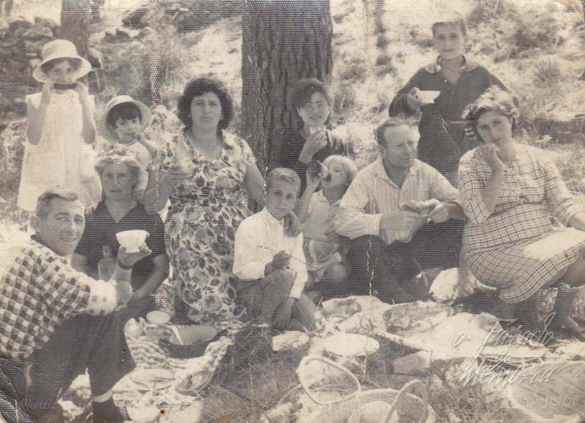 Moncho Berride é Mercedes, Amelia e Ricardo Crespo, eles curmans, fillos de Rosa e Rosario Teijeiro, carrilexas, arrimada a o arbore é Chiruca, filla de Mercedes, e Moncho a ver si alguen identifica a foto