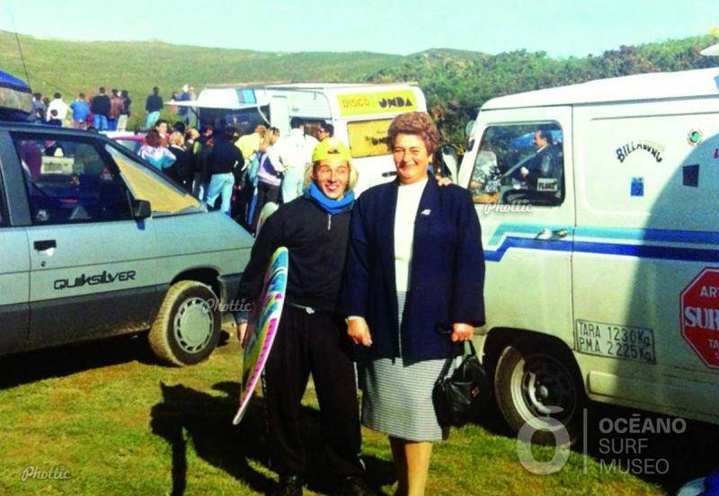 La pasión de los más jóvenes de los Galeiras por el surf fue tal que padres y abuelos se vieron implicados en aquella "aventura". En la foto, uno de los nietos posa feliz con su orgullosa abuela en el Pantin Classic de 1990.