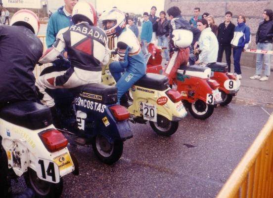 La parrilla de pilotos estaba ya configurada en la fría y lluviosa mañana del extinto circuito Vigués de Bouzas. El ambiente distendido reinaba entre los participantes. José Rabadán y Diego charlan amigablemente antes de darse el banderazo de salida. Ambos equipados con monos de cuero. En el caso de Rabadán, personalizado. Otros como Juan Martínez (Vespa nº 3, piloto de la escudería de su propio padre, Manolo Vespa), lo hacía con diferentes prendas prestadas para la ocasión.