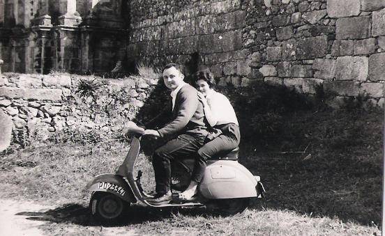 Esta serie de 4 fotos de 1963 ó 1964 están realizadas a la puerta del Monasterio de Oia, con motivo de una salida en pandilla. Formaban parte de un grupo de excursionistas que aquel día seguía una ruta muy popular por aquellas fechas: Vigo - Baiona - Oia - A Guarda (Tegra) - Tui - Vigo. En esta primera instantánea aparecen el Sr. Fulgencio y Fina (Padres de Ginés, todavía solteros).