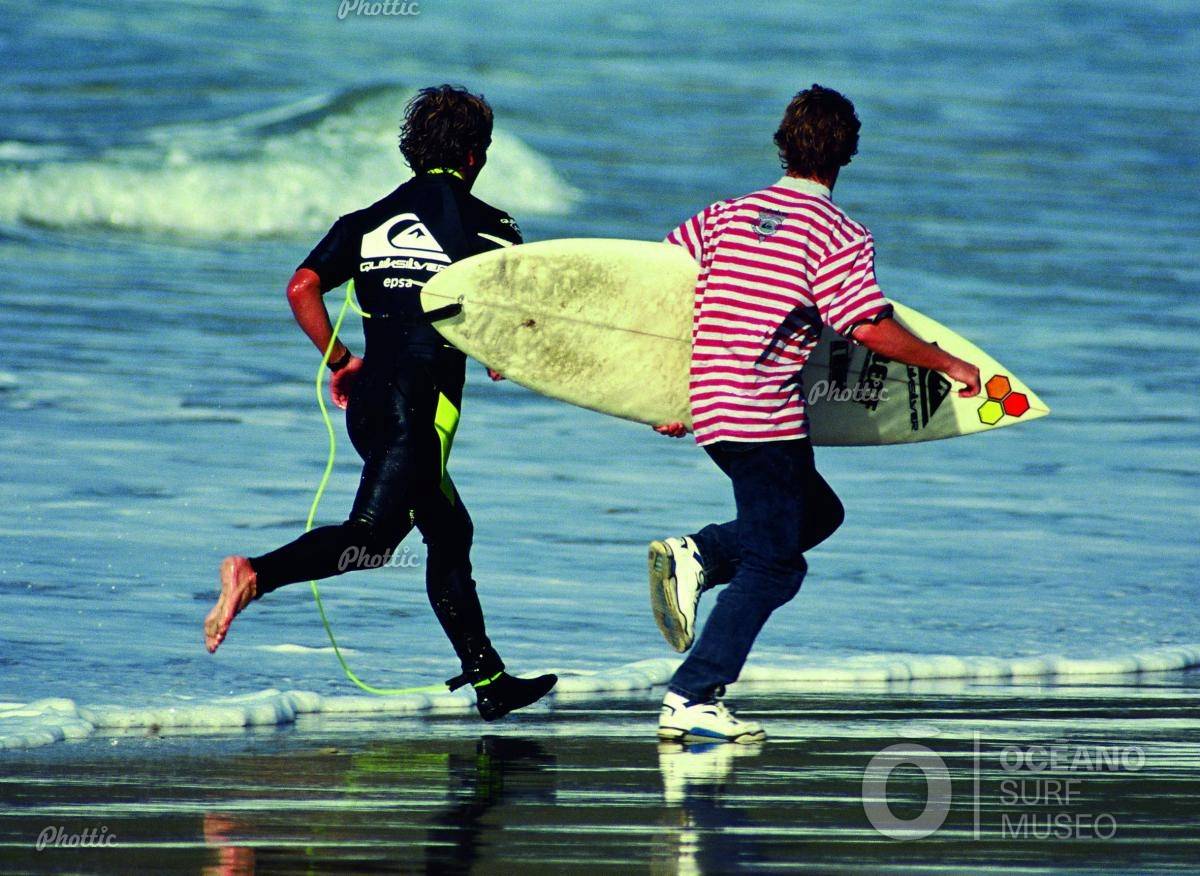 Jorge Imbert haciendo de caddy de Gorka Yarritu. Las grandes series que cayeron en el año 1991 obligaban a los surfistas a tener que remontar pegados a las rocas tras una larga carrera por la orilla. Esta foto refleja bien el espíritu de Pantín: es una competición, sí, pero el compañerismo y el amor al surf están por encima de las rivalidades.