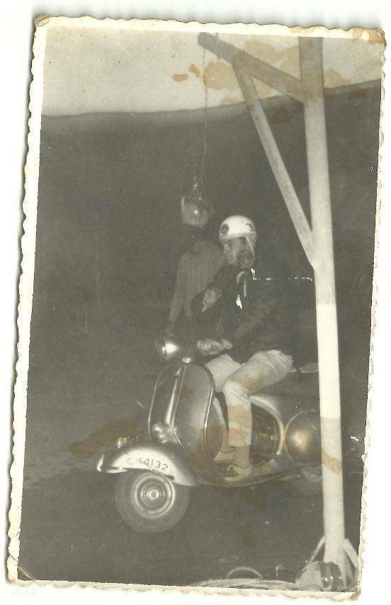 Fotografía de Pepe Yuma compitiendo en una gimcana en Santiago de Compostela. Si nos fijamos bien, del poste de madera cuelga un botijo que había que romper con un martillo. Aquí lo vemos en plena ejecución del reto, sosteniendo el martillo con su mano derecha. La dificultad radicaba en dar un golpe certero antes que el botijo se balancease con motivo del impacto. Era el año 1961. "Lo recuerdo porque nos acabábamos de casar. Le dije a mi mujer que en Santiago había una prueba y que si le apetecía ir. Me dijo que sí y allí nos plantamos. En esta ocasión no pillé nada. -Pepe nos guiña el ojo y apunta en alusión a su reciente casamiento- Tenía cosas más importantes que hacer".