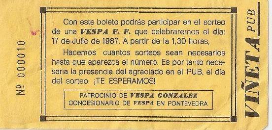 Gracias a la intermediación de Luis Casas-Arruty, os presentamos este ejemplar de la rifa de una vespa en el Pub Viñeta, con el patrocinio de Vespa González. Por aquel entonces, cuando la movida estaba en todo su esplendor, la noche pontevedresa estaba amenizada por locales tán míticos como El Surf, La Cabaña. El cadillac o El club del Gato.