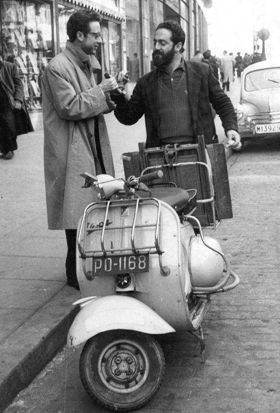 Fotografía de 1957 en la que el artista gallego Xavier Pousa (vestido de oscuro) recibe una botella de vino mientras come un bocadillo. Según cuenta su hija Keila, "Mi padre se desplazaba en esta vespa, en la que puedes ver como en la parte trasera lleva amarrados el caballete y su maleta de pinturas, por toda España en busca de paisajes que retratar". En esta década en concreto, el pintor centró su producción artística en plasmar la esencia de diversos paisajes, retratos y bodegones. "Para poder entender la pintura de Xavier Pousa debemos tener en cuenta una serie de circunstancias que contribuyeron a forjar su estilo artístico. Su primer contacto con la pintura, los estudios de Bellas Artes en Madrid, la apuesta por las corrientes realistas y su implicación en el ambiente cultural gallego, marcan el camino de su obra en la que desde el comienzo apostó por la figuración con la firme intención de no perder el vínculo con la realidad, opción que se traduce en una obra humanizada y en constante dialogo con la naturaleza y con su entorno personal". Para profundizar algo más en la trayectoria de este artista, recomendamos una visita la web de la Fundación Xabier Pousa.