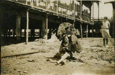 Las componentes de la fotografía son Josefa González Sosin (mi suegra) y su tía Luisa Sosin Saborido fallecida muy joven. La foto puede ser de los años treinta aproximadamente. Resaltar el glamour del toque de sombrilla chinesca para protegerse de los rayos solares en una época en que todavía no se conocían las protecciones solares ni los bronceadores.