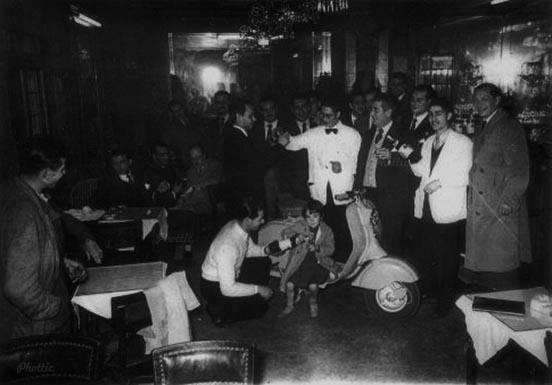 La instantánea fue sacada en 1955 en la cafetería del ya desaparecido CINE FRAGA. Su padre Hipacio González, también camarero de profesión, le contó que por aquel entonces, FUNDADOR con lemas como “Fundador es cosa de hombres” o “Salud, dinero y amor… y un largo de Fundador” llevaba a cabo una promoción entre su clientela. Por cada consumición, el cliente se llevaba una rifa cuyo premio era ni más ni menos que una hermosa, moderna y versátil Lambretta. La fotografía recoge el momento en el que Hipacio hace entrega del premio al afortunado ganador en 1956.