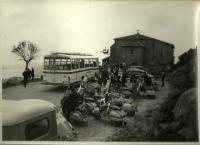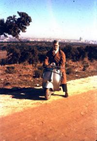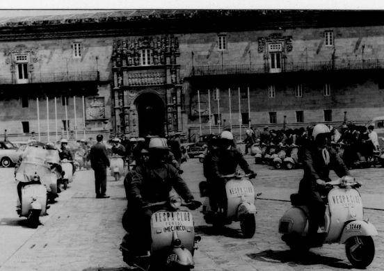 Representantes del Vespa Club El Ferrol abandonan la Plaza de O Obradoiro con motivo de una concentración de clubes gallegos en Santiago de Compostela, a mediados de los años 60. Como se puede apreciar, el mecánico del club iba debidamente identificado por si durante la ruta había que pedirle auxilio. Como telón de fondo, la puerta de entrada del inconfundible Hostal de los Reyes Católicos.