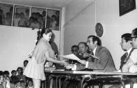 Las bandas estaban hechas de cintas de varios colores, que las chicas de los barrios las bordaban algunas veces ,para las compiticiones que se hacian, tambien se le ponian a las madrinas de los equipos de futbol, y como no a las mises.MargaritaM.