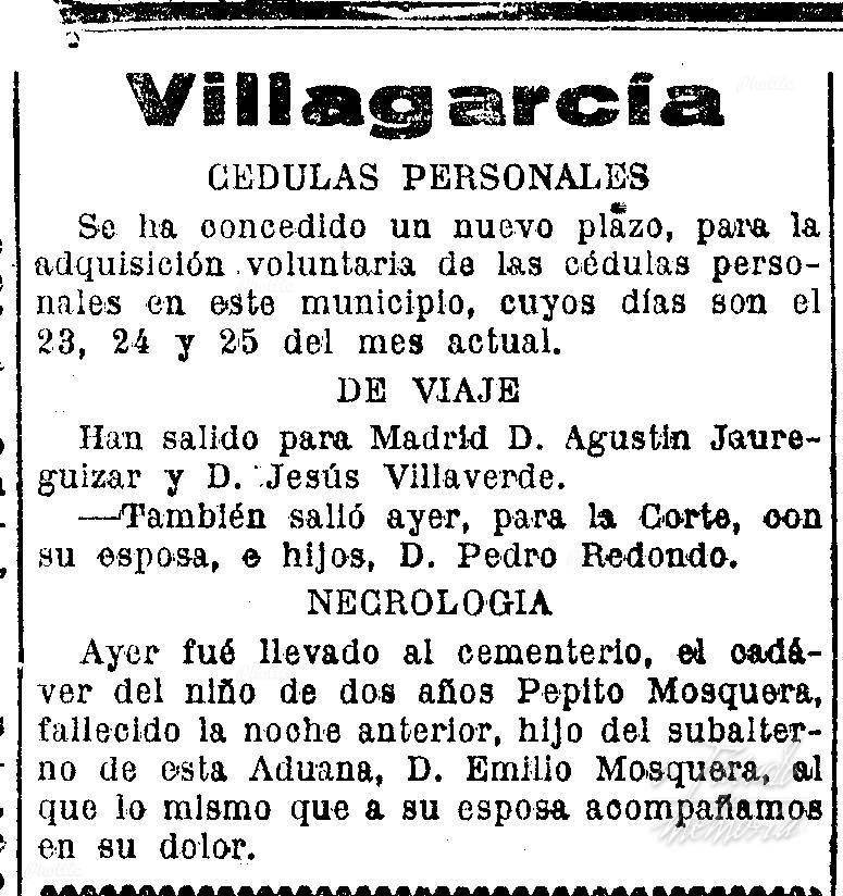 Es una sorpresa encontrar este articulo de periodico, el nino Pepito Mosquera era hermano de mi padre.Mi abuelo Emilio Mosquera trabajo toda su vida en la Aduana, entro muy joven cuando termino de estudiar ,mis abuelos paternos vinieron de Ribadavia despues de casados , y algunos hijos le murieron , quedandose con cinco .