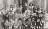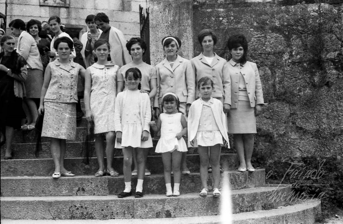 Arredor do 1.965, xente baixando as escaleiras da igrexa de Cornazo e posando para retratarse.