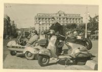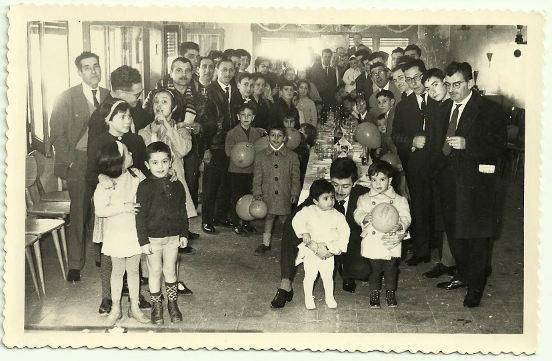 Estampa navideña de los integrantes del Vespa Club Vigo con sus hijos en el local social de la calle Pontevedra. 20-12-1965. En el reverso se puede contemplar el sello de un nuevo fotógrafo: FOTO FERNANDEZ. Ramón Nieto 463-1º Izda Tefº___ VIGO. A la izquierda de la imagen, al lado de la ventana y con las manos en los bolsillos, identificamos a Edilberto Álvarez Soto, delante de él al Sr. San Martín con un grupo de cuatro niños y a la derecha de Edilberto, al Sr. Silva.