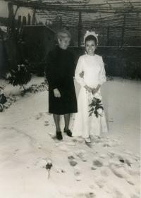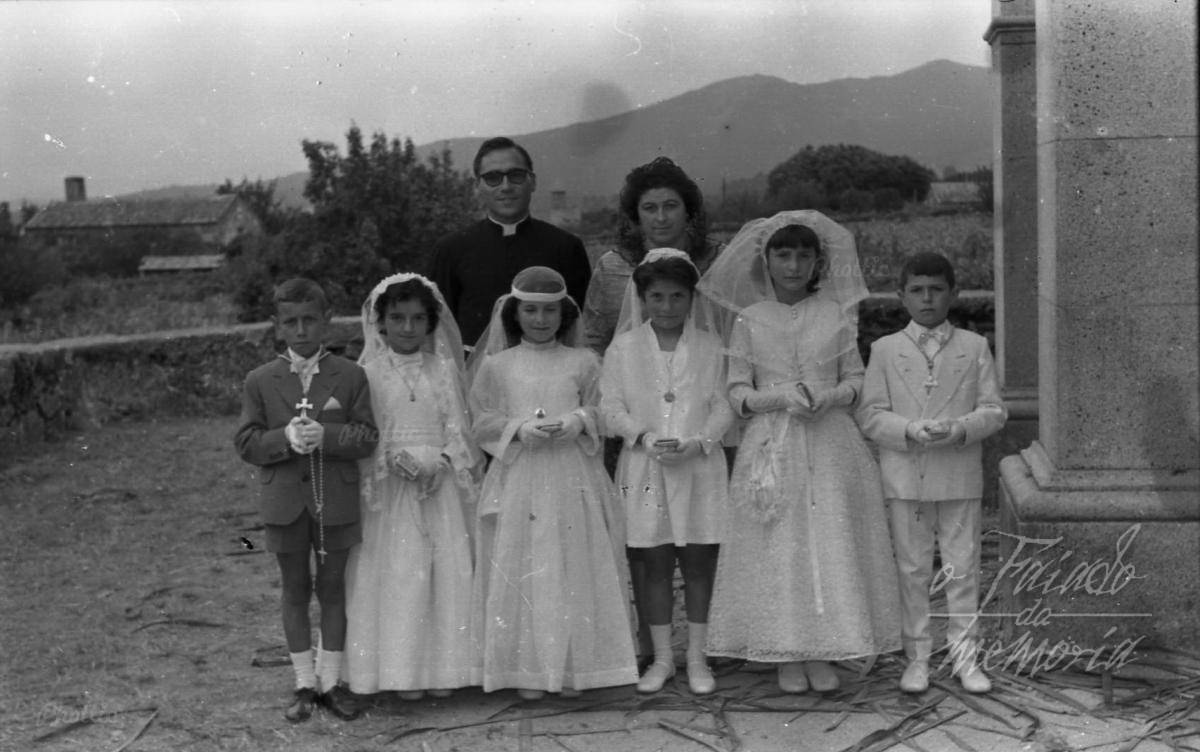 Es en la iglesia de Rubiáns, la tercera por la izquierda, creo que es Esther Paz Tarrío, tía de los hermanos Paz,detrás, doña Carmen, nuestra maestra, y el sacerdote Don Javier? las demás niñas, las tres se llaman Mari Carmen, los chicos tengo mis dudas, la memoria...... Olga Rey Prieto