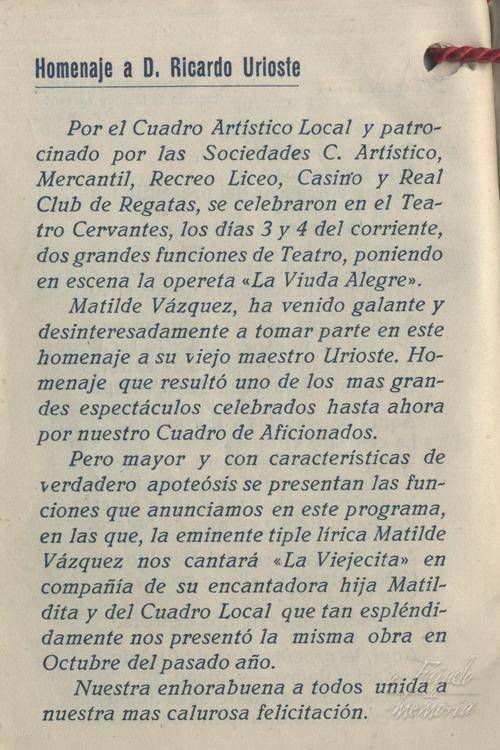 Din que e de ben nacidos ser agradecidos, Matilde Vazquez asi o demostrou facendolle un homenaxe a Urioste que foi a persoa que descubreu as dotes da gran artista de talla internacional