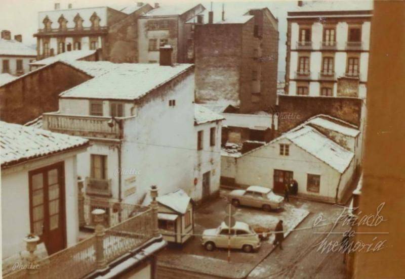 Vemos a tienda de Concha, vemos a taberna do Burato, o kiosco de Armando, a casa de Quinso e Esther a zapateria de Sr Pepe, todo nevado poido ser no Decembro de 1970. Tamen vemos a terraza da casa na que os Comendador tiñan o negocio.. A o fondo a esquerda a casa que construiu o pai de Domingo Villar Granjel