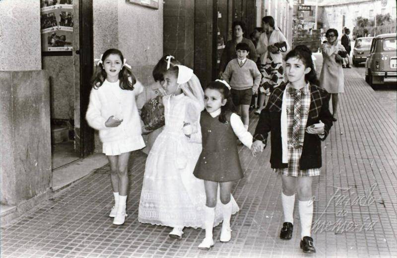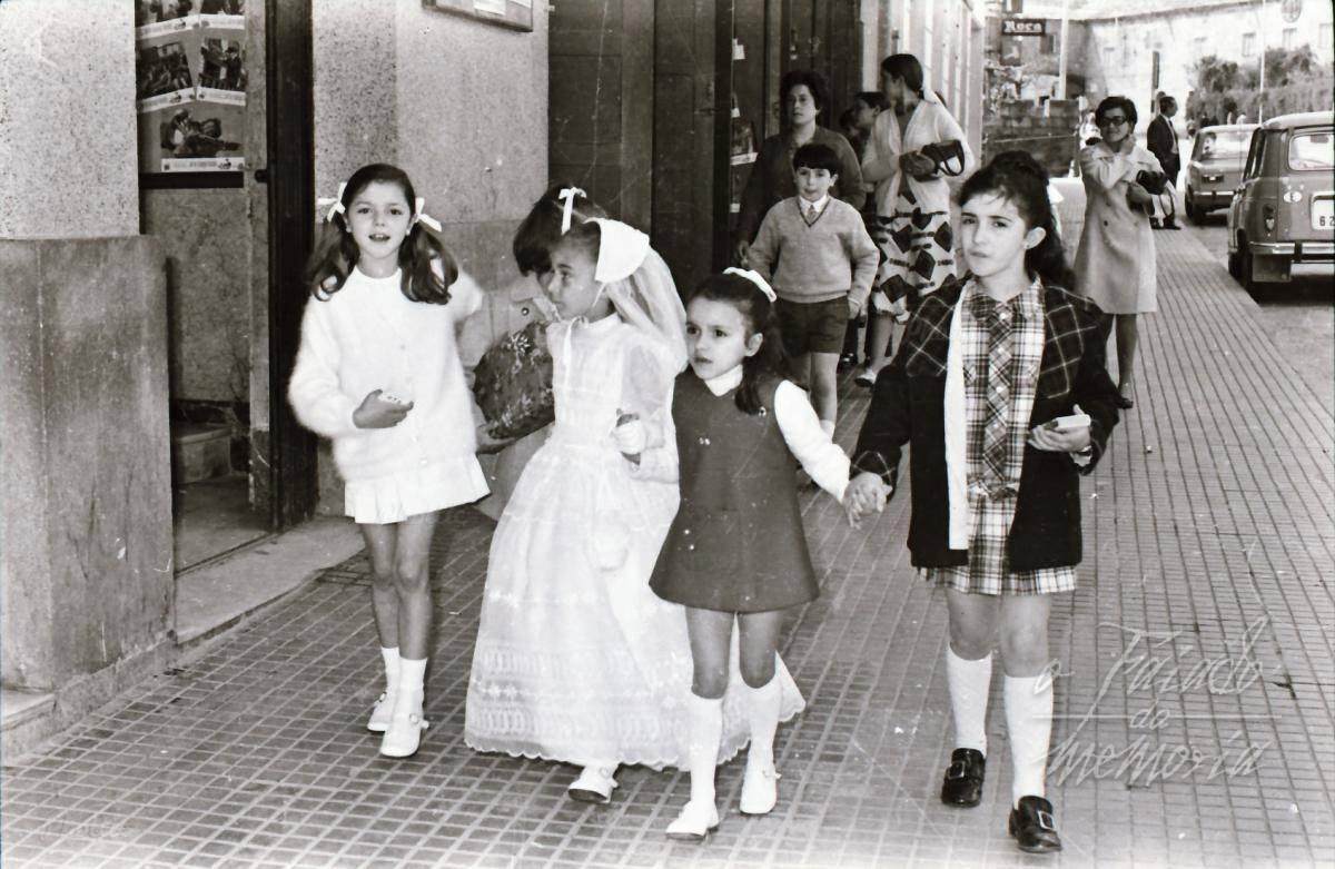 Aproveitamos a Primeira Comunion que baixa desde o Convento de Vista Alegre, sentimos non saber o nome da protagonista e vemos as portas do Cine Cervantes abertas e o feito permitenos ver os cuadros da publicidade da pelicula do dia