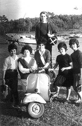 Al acabar el colegio, nada más empezar la estación estival, Juan Rial Nine y toda su familia, hacían las maletas y se iban a la casa que tenían (y todavía conservan) en la Illa de Arosa a pasar todo el verano. Esta fotografía tomada en 1960 corresponde a un grupo de amigas de la pandilla de Juan que decidieron posar elegantemente vestidas con la vespa del fotógrafo Alfonso Lorenzo Urcera, popularmente conocido como “Ferrazo”.