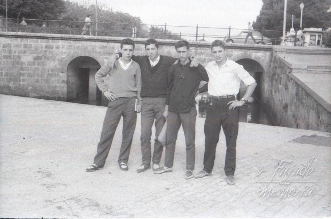 Yo los chicos no los conozco, pero en esta foto se ven bien las casetas que habian al lado del rio, el quiosco de peridicos del Sr.Reiriz, la churreria y a seguir una taberna, a los Domingos a la salida del Cine Cervantes habia colas , en los puestos .M.Mosquera