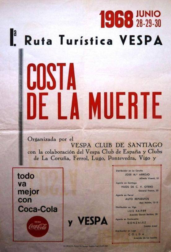 Interesante Cartel de la Iª Ruta turística en Vespa "Costa de la Muerte" organizada por el Vespa Club Santiago. En él se pueden leer tanto el nombre de todos los Agentes y Distribuidores de Vespa en nuestra comunidad a finales de los años 60 y sus direcciones. La fotografía del cartel nos la hizo llegar Antonio Feijoo Martiñá tras una visita a la Biblioteca Pública González Garcés de A Coruña, donde se conserva el original.
