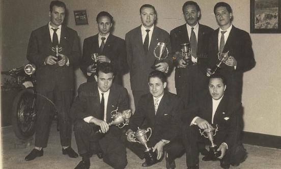 Fotografía grupal en la que aparecen varios miembros de la familia vespista coruñesa. El de abajo a la izquierda, es Genín Malde, el de la joyería Malde (casa fundada en 1898), Jaime López (es el del medio abajo) y el tercero que aparece en cuclillas es el propio hermano de Neira (con bigote). Por su parte, en la fila de arriba podemos ver a Núñez (el del medio de pie), Marfani (segundo por la derecha), Vigil (primero por la derecha, de la farmacia Vigil). El primero por la izquierda, (del que Neira no se acuerda del nombre) es el hermano del que arreglaba las máquinas en la de Balado (Balado anduvo en un microbús llevando gente a Inglaterra). Finalmente, el segundo por la derecha es el propio José López Neira, todos ellos en una entrega de premios en la sede del Motoclub La Coruña a mediados de los años sesenta.