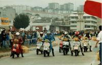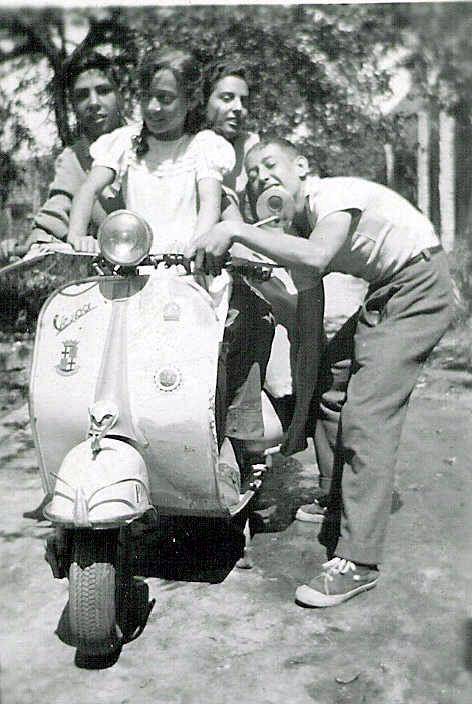 Fotografía de las hermanas de Jorge Jané, María Rosa y Monserrat, en el taller de su padre con unos chicos del barrio. Entorno a 1956. Salvador, un enamorado de las Ducatis, tenía su establecimiento en la Calle Tomás A. Alonso nº 68, cerca de la que hoy se conoce como Plaza de la Industria. Como nos indica su hijo Jorge... "además de reparar vespas, era un taller autorizado Maquitráns, una empresa catalana que fabricaba multitud de vehiculos y una división, Maquitrans-Ducati, representaba en España esta marca. Mi padre representaba a Ducati y unos curiosos trastos de tres ruedas llamados motriciclos".