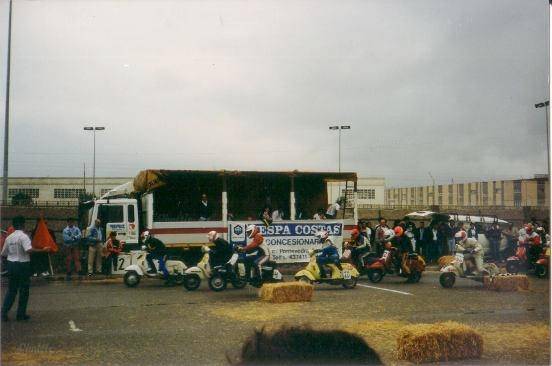 Con los pilotos dispuestos a iniciar la prueba, rugen los motores. Todos echados hacia delante para hacer frente a la potencia de unos motores que acelerarían en tan sólo unos instantes. De fondo, uno de los camiones de la empresa Viguesa Reiriz (especialista en el transporte de embarcaciones) que servía tanto para trasportar las balas de paja que delimitaban el circuito como de esponsorizado Box para los jueces de la prueba.También podemos ver un cartelón de VESPA COSTAS, histórico concesionario de Vespa en Vigo, sucesor directo del desaparecido KAIFER.