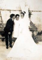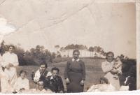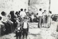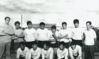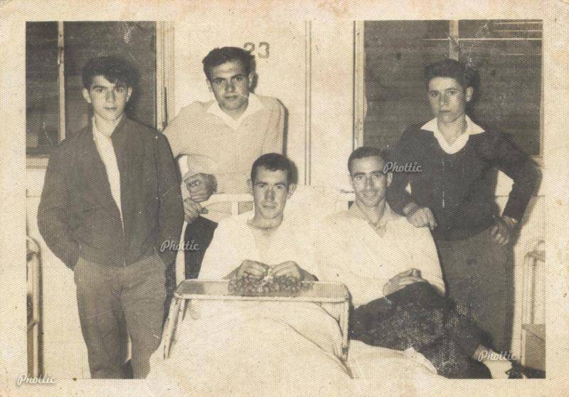 De visita no Hospital de Marina en Ferrol en 1960. De esquerda a dereita: Manolo Dopico, Horacio de Pereira, Juan Pereira (convaleciente) Pepe de Mourente e Plácido de Chinto.