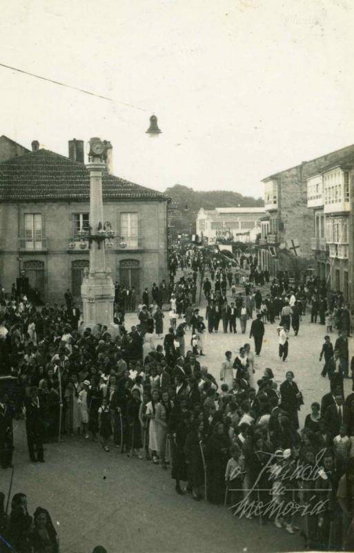 No Obelisco, esta a pasar a procesion da Santa Rita, a o fondo a dereita a rua Arzobispo Lago, ainda non estaba construido o edificio da familia Olmedo, a o fondo vemos a Praza de Abastos