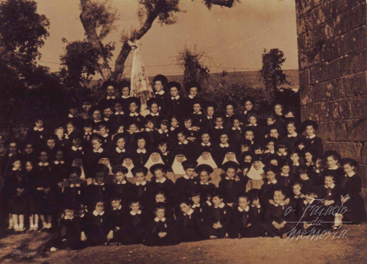 Hola a todas-os. Aínda que son da miña quinta, non estou segura de ser eu, a primeira pola dereita da terceira fila, apoiada na parede, pero si recoñezo as duas hirmáns Rivera Maio, a Merceditas ,5ª pola derita da 1ª fila, Olga Nartallo, MªCarmen Cardeñoso, na fila do estandarte,a 1ª dereita, creo que a de Calicó, que logo foi profesora. As monxas son, "Madre" Asunción, Beatriz, Pura, Antonia, Carmen...... Recoñezo máis caras, pero non sei o nome, intentaréino, outro día. Un saudo