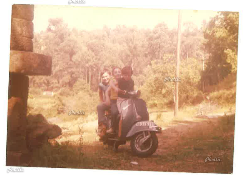 Lola Vargas nos cuenta que.... "en esta foto aparezco con mis dos hermanos subidos a la vespa de mi padre. Era el año 1979. La foto está tomada en el jardín de nuestra casa. Al lado del hórreo. Recuerdo que mi padre nos llevaba al cole en su vespa. Donde vivíamos, no había autobús para ir al colegio".