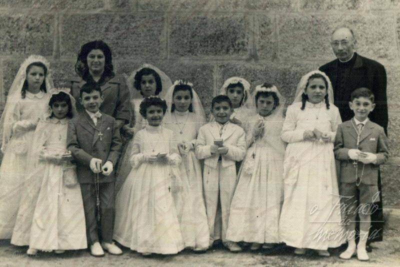 A foto debe ser do 58. A Sra que aparece é Dª Carmen Rguez Outeiral, mestra que foi toda a súa vida en Rubiáns, e á que moitos lle debemos moito. Non a esqueceremos. O cura é Juan Piai. Era un cura á vella usanza. Por exemplo a mín non me quixo bautizar porque meus pais chegaron uns minutos tarde. Logo arrepentíuse, e bautizoume. Pero era moi especial. Nunha ocasión, en plena homilía durante a misa, e dado que estaba durando mais do normal, un feligrés rosmou polo baixo algo así como "haber se acabas xa". Piai escoitou o que decía o vello, baixou do púlpito, foi ó final da iglesia, encarouse co feligrés, e, sen mediar palabra, soltoulle dúas sonoras bofetadas que deberon soar como cañonazos. Deuse a volta, subíu ó púlpito, e seguíu coa homilía.